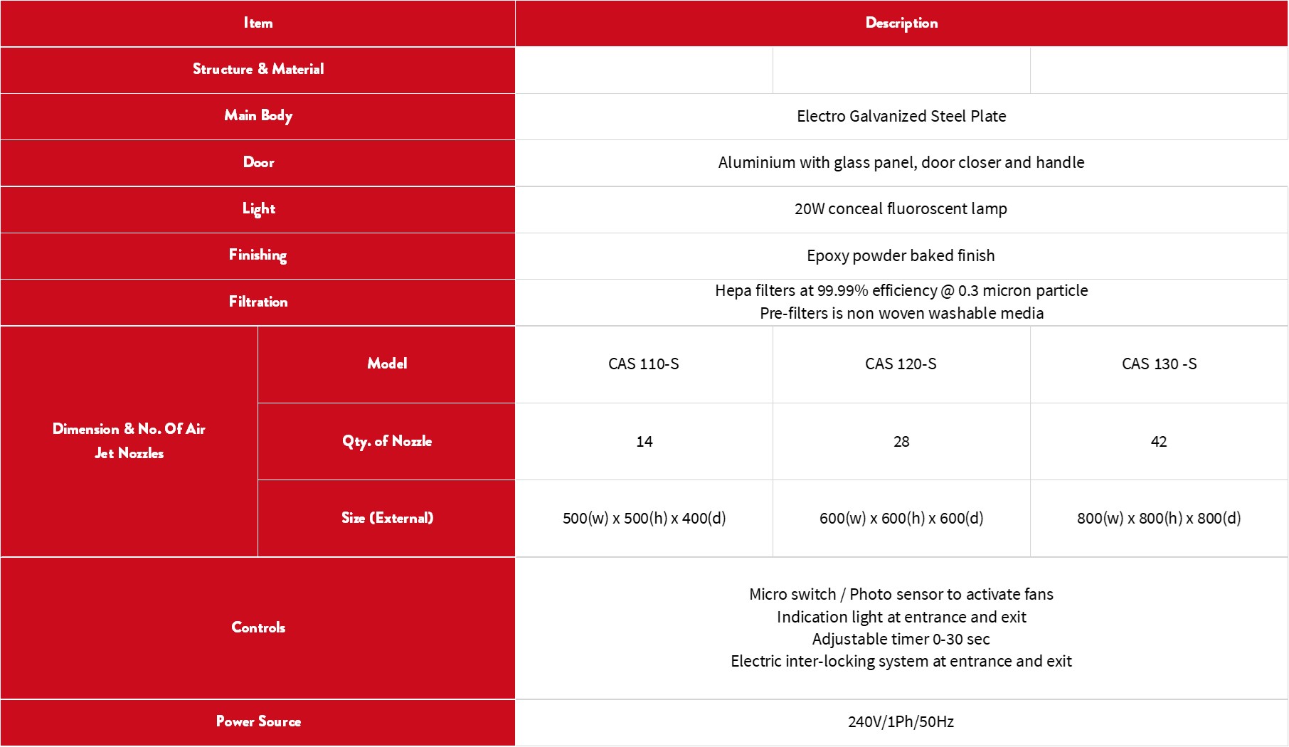 Air Shower is automatically actuated upon entry - releasing a bath of clean air from the side wall and ceiling. After a timed duration, shower shuts off and allow exit. The HEPA filter air is 99.99% efficient @0.3 micron, and is recirculated for contamination purposes.